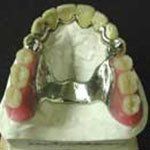 Bei diesem Zahnersatz werden künstliche Zähne an einer Metallbasis befestigt und über Klammern mit den Restzähnen verbunden.